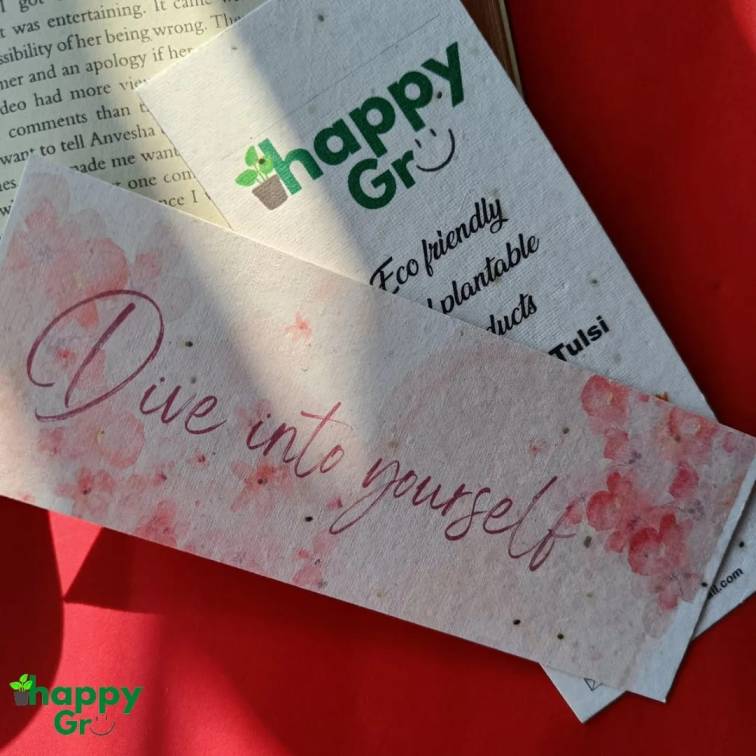 HappyGro Plantable Bookmarks: read, plant, grow! Crafted from recycled paper with embedded TULSI seed capsules, these bookmarks sprout new life when planted. Eco-friendly and fun—a sustainable twist to your reading routine